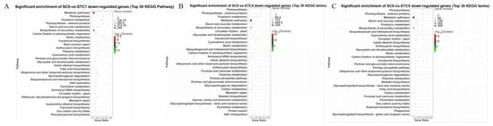 Enrichment analysis of KEGG pathway for downregulated differentially expressed genes (top 30 pathways). (A) SC0-vs.-STC1 downregulation of DEGs KEGG pathway significantly enriched bubble plot; (B) SC0-vs.-STC4 downregulation of DEGs KEGG pathway significantly enriched bubble plot; (C) SC0-vs.-STC5 downregulation of DEGs KEGG pathway significantly enriched bubble p1lot.