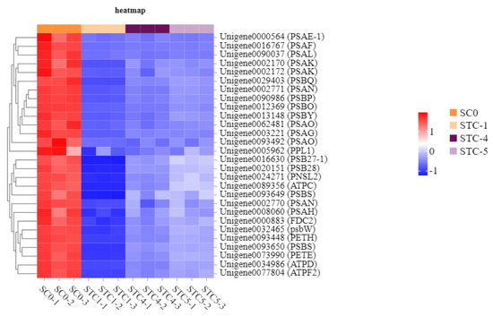 Heat map of the amount of gene expression regulated by the photosynthesis—antenna protein pathway.