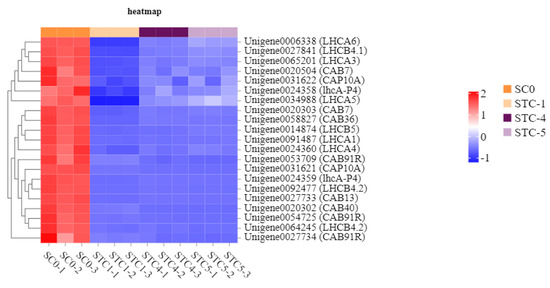 The significantly downregulated genes annotated to the photosynthesis—antenna proteins (light reaction) pathway included LHCA6 (Unigene0006338), LHCB4.1 (Unigene0027841), LHCA3 (Unigene0065201), CAB7 (Unigene0020504), CAP10A (Unigene0031622), 1hcA-P4 (Unigene0024358), LHCA5 (Unigene0034988), CAB7 (Unigene0020303), CAB36 (Unigene0058827), LHCB5 (Unigene0014874), LHCA1 (Unigene0091487), LHCA4 (Unigene0024360), CAB91R (Unigene0053709), CAP10A (Unigene0031621), 1hcA-P4 (Unigene0024359), LHCB4.2 (Unigene0092477), CAB13 (Unigene0027733), CAB40 (Unigene0020302), CAB91R (Unigene0054725), LHCB4.2 (Unigene0064245), and CAB91R (Unigene0027734). These genes encode the following light-harvesting chlorophyll a/b-binding proteins (LHC): Light-harvesting complex I chlorophyll a/b-binding protein 1, Light-harvesting complex I chlorophyll a/b-binding protein 2, Light-harvesting complex I chlorophyll a/b-binding protein 3, Light-harvesting complex I chlorophyll a/b-binding protein 4, Light-harvesting complex I chlorophyll a/b-binding protein 5, Light-harvesting complex II chlorophyll a/b-binding protein 1, Light-harvesting complex II chlorophyll a/b-binding protein 2, Light-harvesting complex II chlorophyll a/b-binding protein 3, Light-harvesting complex II chlorophyll a/b-binding protein 4, Light-harvesting complex II chlorophyll a/b-binding protein 5, and Light-harvesting complex II chlorophyll a/b-binding protein 6 (Figure 11).