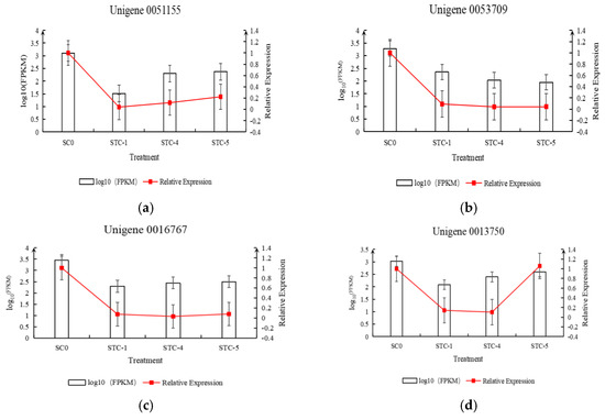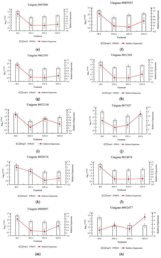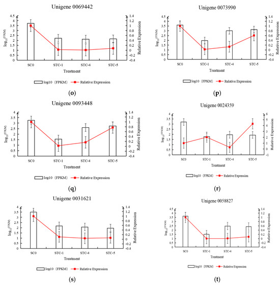 Based on the transcriptomic data, 20 differentially expressed genes were selected for qRT-PCR experiments and analysis. The relative expression levels of the genes, calculated using FPKM and qRT-PCR results, were plotted on the vertical axis, while the treatment timepoints were plotted on the horizontal axis to create a dual-y-axis bar-line chart. As shown in Figure 13, the trends in FPKM values over time for the selected 20 differentially expressed genes were generally consistent with the trends in relative expression levels calculated from the qRT-PCR results.