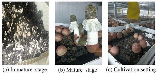 Each treatment included nine cultivation boxes to ensure adequate biological replication and statistical reliability. Each cropping cycle lasted 150 days. Throughout the cultivation period, environmental conditions—including air temperature, humidity, and light—were carefully adjusted according to the developmental stage of Dictyophora rubrovalvata. These parameters are summarized in Table S2. Temperature and humidity were automatically controlled via a greenhouse environmental monitoring system equipped with real-time sensors and feedback regulation. Light intensity was manually managed using adjustable shading panels and light diffusers.