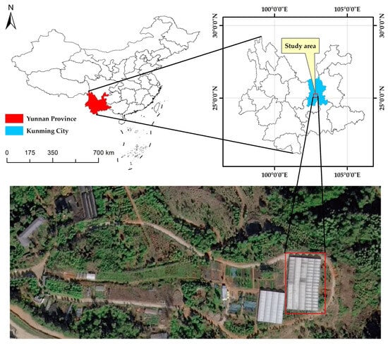 The experiment was conducted in a temperature- and humidity-controlled glass greenhouse located in the Arboretum of Southwest Forestry University, Panlong District, Kunming City, Yunnan Province, China (25°14′ N, 102°45′ E). A location map of the study site is provided in Figure 2.
