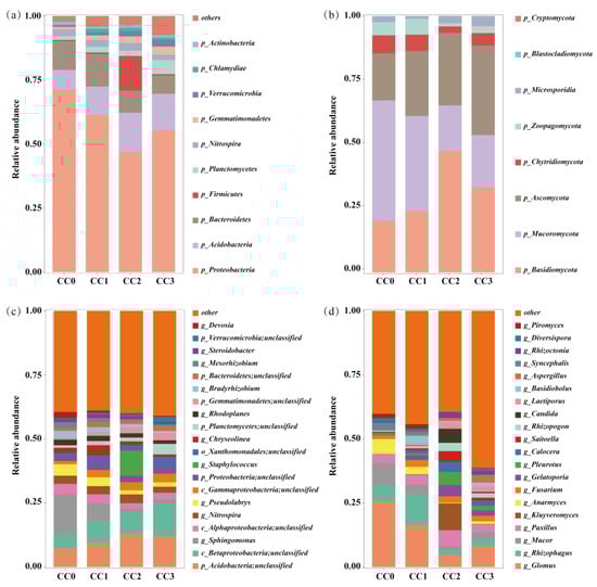 Composition of soil microbial communities under different continuous cropping treatments. (a,b) Relative abundances at the phylum level and (c,d) at the genus level. (a,c) Bacteria. (b,d) Fungi. CC0: Uncultivated; CC1: one cropping cycle; CC2: two cropping cycle; CC3: three cropping cycle.