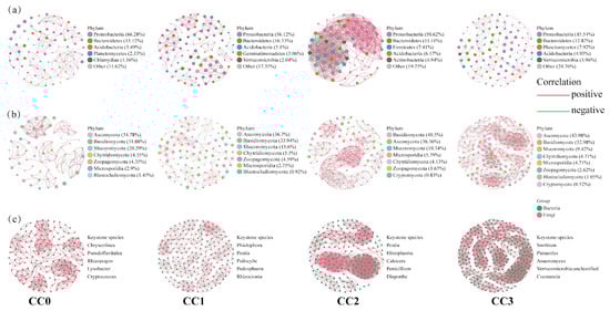 Co-occurrence networks of (a) bacterial communities, (b) fungal communities, and (c) bacterial and fungal communities under different continuous cropping treatments. Red line: positive correlation; green line: negative correlation. For each treatment, five keystone genera with the highest betweenness centrality scores were identified. CC0: Uncultivated; CC1: one cropping cycle; CC2: two cropping cycle; CC3: three cropping cycle.