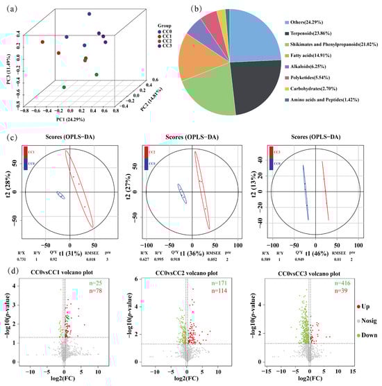 Principal component analysis (PCA) revealed clear separations among the different continuous cropping treatments, indicating that continuous cultivation significantly altered the composition of soil metabolites (Figure 6a). This trend was further validated using orthogonal partial least squares discriminant analysis (OPLS–DA), which showed distinct separation between the control group (CC0) and each of the continuous cropping groups (CC1, CC2, and CC3). The OPLS–DA models exhibited good fitness and predictive ability, with R2Y/Q2Y values of 1/0.92 (CC0 vs. CC1), 0.995/0.918 (CC0 vs. CC2), and 1/0.949 (CC0 vs. CC3) (Figure 6c).