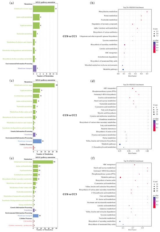 KEGG enrichment analysis of differential metabolites. (a,b) Differential metabolic pathway classification and KEGG enrichment analysis for CC0 vs. CC1; (c,d) for CC0 vs. CC2; and (e,f) for CC0 vs. CC3. In the bar charts (a,c,e), the vertical axis represents KEGG classifications, with Class A categories shown in black and Class B categories in colored text. The horizontal axis indicates the number of metabolites annotated under each Class B pathway. In the bubble plots (b,d,f), the vertical axis lists pathway names, and the horizontal axis indicates the Rich Factor. Bubble color corresponds to p-value (darker red indicates more significant enrichment), while bubble size reflects the number of enriched differential metabolites. CC0: Uncultivated; CC1: one cropping cycle; CC2: two cropping cycle; CC3: three cropping cycle.