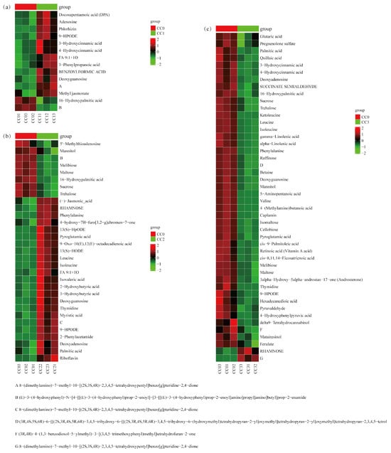 Heatmap of critical differential metabolites clustering enriched in the first five pathways among treatment groups. (a) CC0 vs. CC1, (b) CC0 vs. CC2, and (c) CC0 vs. CC3. CC0: Uncultivated; CC1: one cropping cycle; CC2: two cropping cycle; CC3: three cropping cycle.