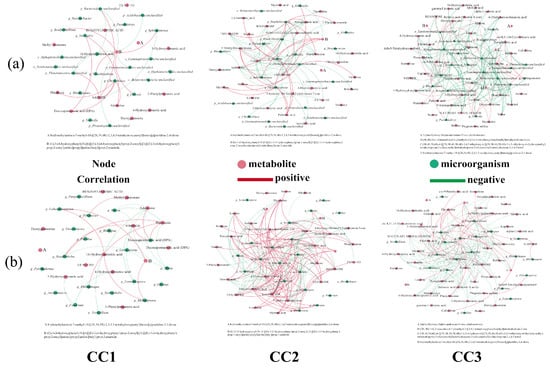 Correlation of the top 20 (a) bacteria and (b) fungi, in terms of relative abundance, with the differentially expressed metabolites involved in metabolic pathways. Red dots: metabolites; green dots: microorganisms; red line: positive correlation; green line: negative correlation. CC0: Uncultivated; CC1: one cropping cycle; CC2: two cropping cycle; CC3: three cropping cycle.