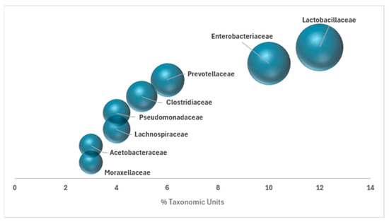 Overall, a comprehensive metagenomic analysis was performed on a pooled sample comprising all effluents collected during the September wine campaign. This integrated approach aimed to provide a broad overview of the microbial diversity present across the three sampling weeks over the same campaign. From these three samples, a total of 450 operational taxonomic units (OTUs) were identified, representing groups of phylogenetically related microorganisms. The results revealed a marked diversity in the bacterial community, with notable predominance of the families Lactobacillaceae and Enterobacteriaceae, accounting for 12% and 10% of the relative OTU abundance, respectively. The most prevalent bacterial families, those exceeding 2% in relative abundance, are illustrated in Figure 1 and together represent 47% of the total detected microbial population.