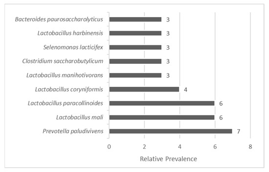 Addressing the specific species identified (87 in total; Figure 2), Prevotella paludivivens and five Lactobacillus species emerged as the most prevalent bacterial taxa in the pooled effluent sample. Notably, Prevotella paludivivens stands out as one of the few species within the Prevotella genus that originates from natural habitats rather than mammalian microbiota. It is capable of degrading various polysaccharides, producing metabolic end-products such as acetate and succinate, which are of interest for biofuel production and bioprocessing applications [34,35].
