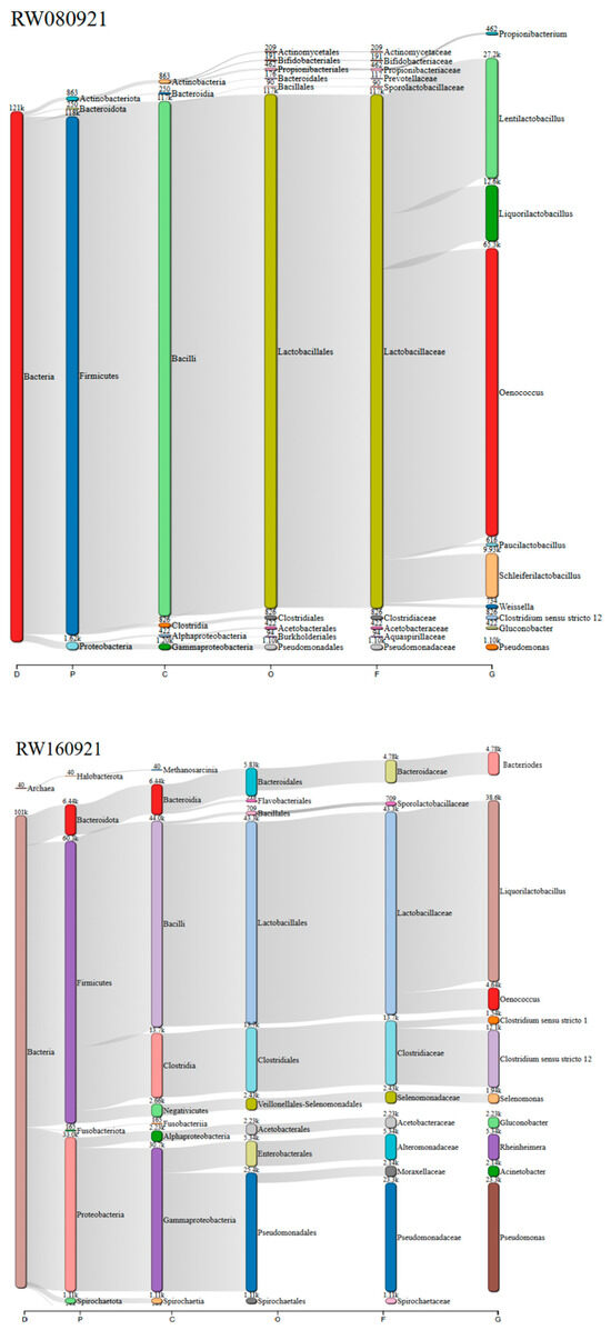 The Krona chart analysis of the RW160921 (Figure 4b) sample revealed a bacterial community composed primarily of Liquorilactobacillus (38%), Pseudomonas (23%), Clostridium (14%), Oenococcus (5%), and Acinetobacter (2%).