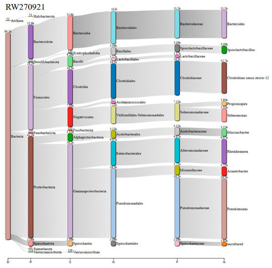 Additionally, the Krona chart of the RW080921 enabled the identification of low-abundance genera such as Pseudomonas (0.9%), whose presence was only subtly suggested in the Sankey diagram due to its qualitative rather than quantitative nature.