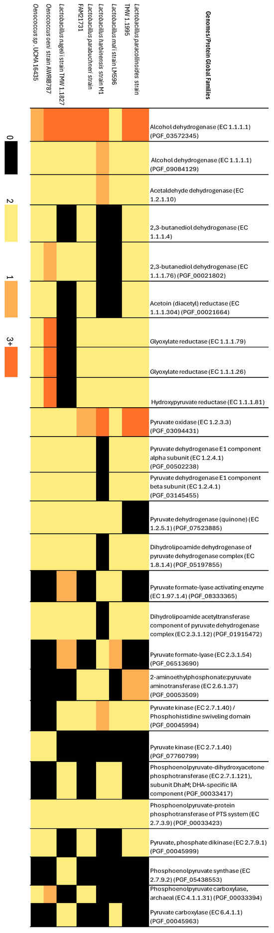 The PATRIC database was used to compare global families of proteins (PGF) involved in biochemical pathways across a set of LAB bacteria, leveraging their genomic data. This analysis specifically examined pathways associated with alcoholic fermentation, malolactic fermentation, and glycolysis. Alcohol dehydrogenase (EC 1.1.1.1) is ubiquitous across all represented microorganisms, with a higher prevalence observed in Lactobacillus spp. It was noted to be categorised into various global protein families among different genes (Figure 6). This genomic diversity results in distinct colour patterns in the heatmap. The protein family acetoin (diacetyl) reductase (EC 1.1.1.304) catalyses the conversion of (S)-acetoin and NAD(+) to diacetyl, H(+), and NADH. This enzyme is consistently linked with the activity of 2,3-butanediol dehydrogenase (EC 1.1.1.4 and EC 1.1.76), which reversibly converts (S)-acetoin to (S, S)-butane-2,3-diol, as shown in previous studies [54,55].
