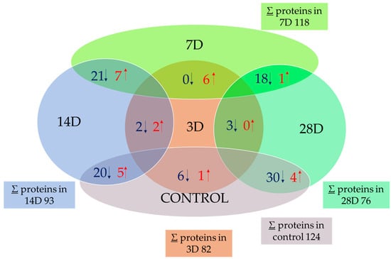 The total amount of significantly altered proteins (Table 3) in the control group was 255.5 fmol—it was significantly reduced in sample 3D (129.3 fmol) and 28D (140.9 fmol), while in sample 7D the amount was slightly increased (264.2 fmol) and in 14D significantly increased (315.5 fmol).