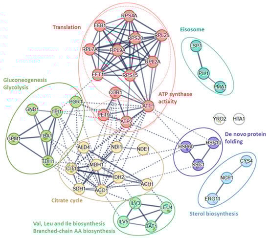 The cluster of translation proteins (Figure 4, Table 3) consists of nine proteins (Efb1, Eft1, Rpl2A, Rpl7A, Rpl9A, Rpl28, Rps4A, Rps15, Rps20). There are four proteins of proton-transporting two-sector ATPase complexes (Atp1, Atp2, Cor1, Pet9), six proteins of glycolysis/gluconeogenesis (Fba1, Gnd1, Gpm1, Por1, Tdh1, Tpi1) and nine TCA cycle proteins (Ach1, Aco1, Ald4, Cit1, Idh2, Mdh1, Ndi1, Nde1, Sdh1). Four proteins are involved in the biosynthesis and metabolism of amino acids (Bat1, Ilv3, Ilv5, Leu4), three are involved in de novo protein folding (Hsp10, Hsp60, and Ssc1), are involved in sterol biosynthesis (Cys4, Erg11, Ncp1), and three are involved in the formation of the Eisosome filament (Lsp1, Pil1, and Pma1). There are two non-classified (diverse group of) proteins (Hta1 and Yro2).