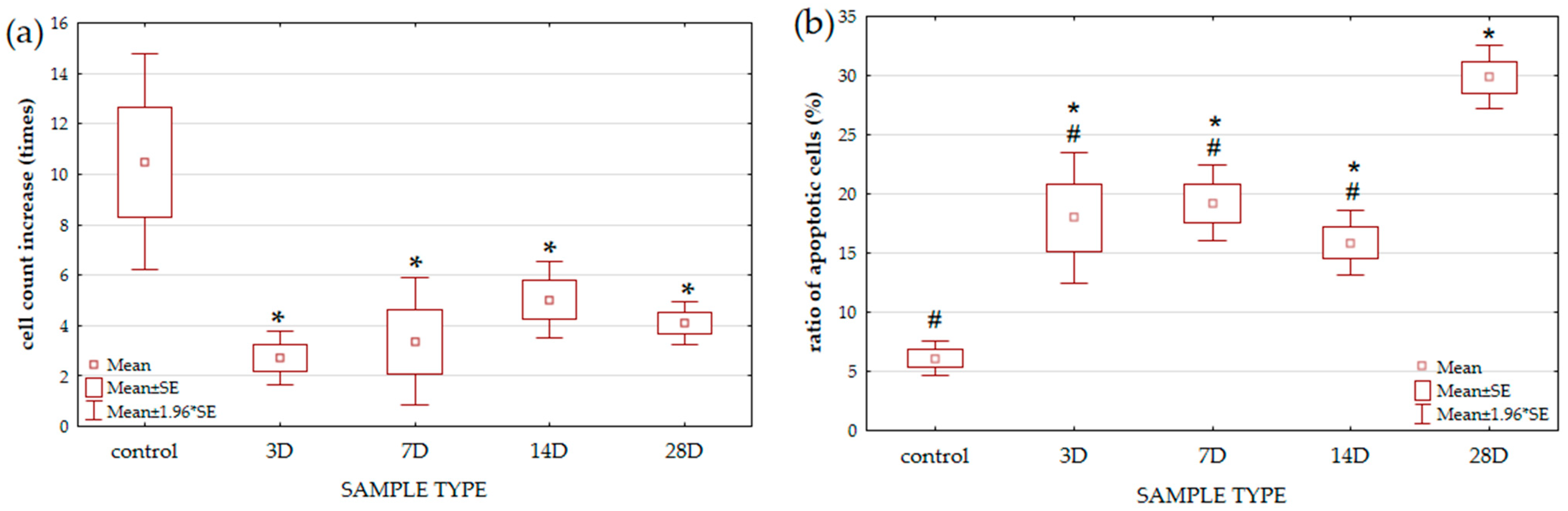 30]. These cells were analyzed from at least 250 cells in every biological replicate. PI only penetrates cells with damaged membranes. Therefore, dying, dead, and necrotic nucleated cells stained with PI produce red fluorescence. AO is a cell-permeable dye, and all living, metabolically active stained nucleated cells produce green fluorescence. An Olympus BX51 fluorescence microscope (Olympus, Tokyo, Japan) was used for microscopic analysis, and ImageJ software (version 1.53t, National Institutes of Health, Bethesda, MD, USA) for image processing.