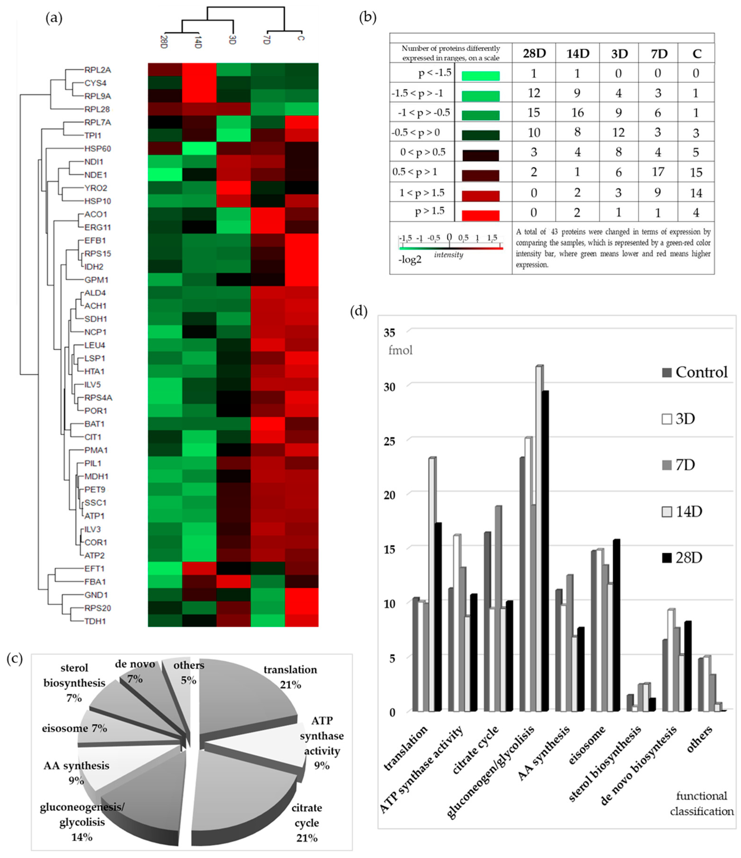 Figure 3c,d). In the untreated control group, which can be considered a reference, the metabolic processes for energy supply (glycolysis/gluconeogenesis, TCA cycle, and ATP synthesis) dominated with 50% of the total amount of significantly altered proteins. Although the total amount is almost the same in all samples, there is a significant difference in the distribution of proportions. Interestingly, differences were observed even among the treated samples. In the 14D and 28D samples, the proportion of gluconeogenic/glycolytic proteins increases significantly, primarily due to Glyceraldehyde-3-phosphate dehydrogenase (Tdh), whose levels nearly double compared to the control, while the proportion of TCA cycle enzymes in those samples is reduced. The opposite was with the sample 7D, whose gluconeogenic/glycolytic protein content was the lowest (lowest Tdh), while TCA cycle enzymes were the highest, mainly because of the presence of Idh (subunit of isocitrate dehydrogenase) and two acetate metabolism proteins (aldehyde dehydrogenase, Ald4, and acetyl-CoA hydrolase, Ach1).