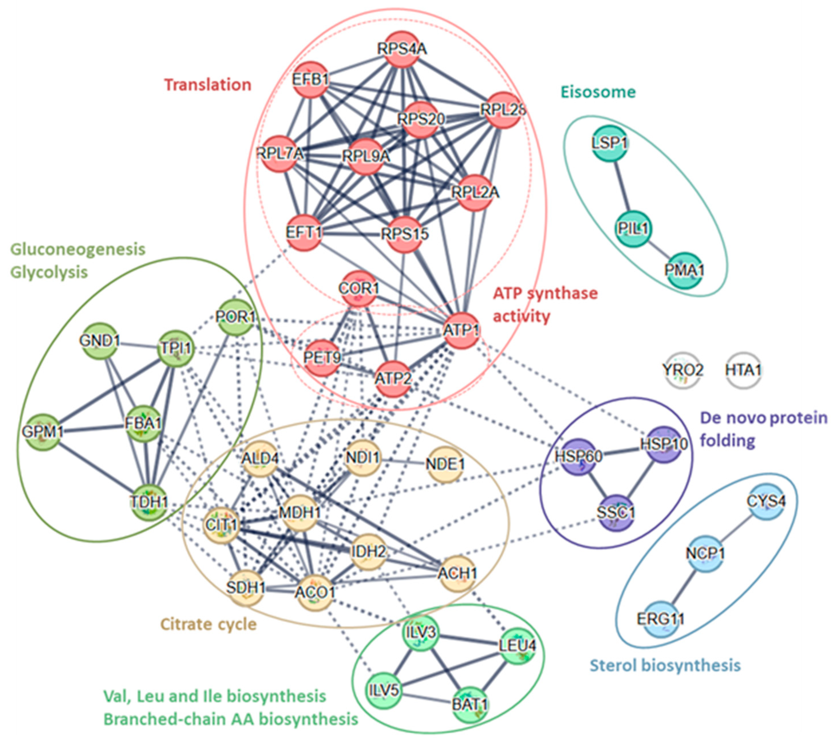 Table 3) consists of nine proteins (Efb1, Eft1, Rpl2A, Rpl7A, Rpl9A, Rpl28, Rps4A, Rps15, Rps20). There are four proteins of proton-transporting two-sector ATPase complexes (Atp1, Atp2, Cor1, Pet9), six proteins of glycolysis/gluconeogenesis (Fba1, Gnd1, Gpm1, Por1, Tdh1, Tpi1) and nine TCA cycle proteins (Ach1, Aco1, Ald4, Cit1, Idh2, Mdh1, Ndi1, Nde1, Sdh1). Four proteins are involved in the biosynthesis and metabolism of amino acids (Bat1, Ilv3, Ilv5, Leu4), three are involved in de novo protein folding (Hsp10, Hsp60, and Ssc1), are involved in sterol biosynthesis (Cys4, Erg11, Ncp1), and three are involved in the formation of the Eisosome filament (Lsp1, Pil1, and Pma1). There are two non-classified (diverse group of) proteins (Hta1 and Yro2).