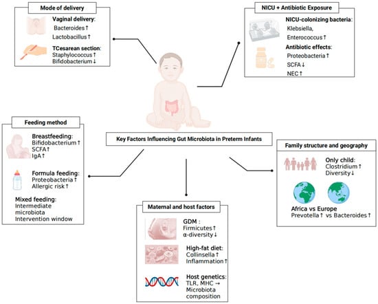 In summary, the colonisation of gut microbiota in preterm infants is influenced by multiple interrelated factors, including mode of delivery, NICUs environment and antibiotic exposure, feeding practices, maternal metabolic status and dietary patterns, host genetic background, and geographical and family atmosphere. These factors interact across prenatal and postnatal stages, collectively shaping the early establishment and developmental trajectory of the gut microbial ecosystem, as illustrated in Figure 1.