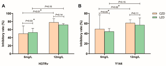 The inhibitory rate of contezolid and linezolid on intracellular Mtb replication. (A) Comparison of the inhibitory effects of the two drugs on H37Rv replication at concentrations of 6 mg/L and 12 mg/L. (B) Comparison of the inhibitory effects of the two drugs on Y-144 (one MDR-TB clinical isolate) replication at concentrations of 6 mg/L and 12 mg/L. Inhibitory rate = (CFU in the control group-CFU in the drug treatment group)/CFU in control group × 100%. * reprensents the p-value < 0.05.
