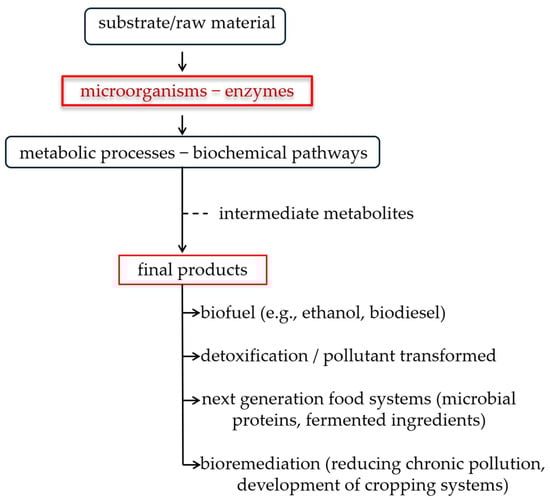 Figure 1 illustrates how the feedstock or substrate is transformed by microorganisms or enzymes through specific metabolic processes, generating various products of interest. Within this flow, biochemical pathways lead to the formation of intermediate metabolites, which can subsequently be exploited for the production of biofuels (ethanol, biodiesel, hydrogen), for the detoxification of pollutants or environmental bioremediation, as well as for the development of new generation food systems, such as microbial proteins and fermented ingredients. This scheme highlights the central role of microorganisms and enzymes in the transformation of biological resources into sustainable and value-added products, emphasizing the interconnection between bioenergy, environmental protection and food innovation.