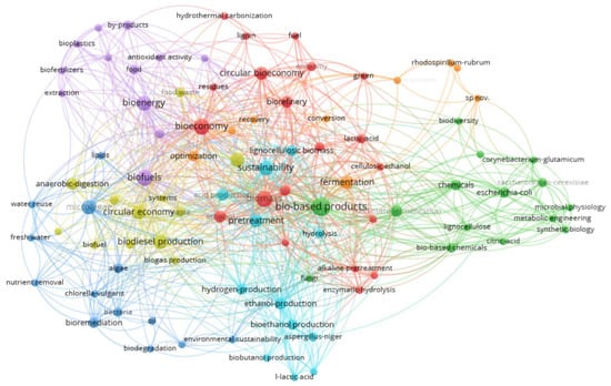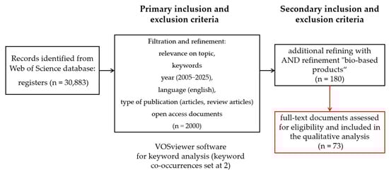 Later, we filtered the documents based on the following considerations: the publication period (the study is based on the query of documents from the last 20 years, the period of 2005–June 2025), the type of publications (articles and reviews), the language of publication (English), and open access status. The total generated was over 2000 publications, but only 180 met our inclusion requirements. Additionally, we included the key term with the additional AND refinement, “bio-based products”. The additional refinement generated a number of 73 documents that were analyzed in detail for the study of microorganisms in the context of sustainability in the agri-food system transition. We then incorporated these documents for further analysis in VOSviewer software (version 1.6.20) for keyword analysis, selecting the minimum number of keyword co-occurrences as 2. Thus, out of the total number of 486 keywords, 93 met the threshold (Figure 2).