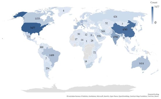 Regarding the contextual analysis from the perspective of spatial terms, we observe in Figure 5, the diversity and popularity of this aspect at a global level. Hotspots are represented by the USA and East and South Asia (China and India, respectively), but the European Union is also among the regions with an increased number of publications in this direction. Among the latter, the top countries with the most publications on this topic include Italy, Spain, Germany, and France. These demonstrate nothing more than the concerns shared at a global level regarding the desire to reform and transition the agricultural system, and implicitly the food system, to a more sustainable, durable, and feasible one in generic terms of the circular economy.