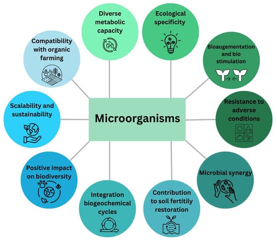 The contribution of microorganisms to soil fertility is also emphasized by their involvement in the formation and stabilization of soil aggregates, by producing extracellular polymeric substances that bind mineral particles and organic matter into a stable structure, favorable to aeration and water retention. This process, essential for preventing erosion and maintaining soil structure, creates an optimal environment for the development of a diverse microbiome, capable of supporting ecosystem functions in the long term. By degrading organic matter and transforming it into humus, microorganisms contribute to increasing the soil’s capacity to store nutrients and water, thus enhancing the resilience of agroecosystems to climate change [48,49,51]. We have summarized, in Table 1, the role of microorganisms in the bioremediation process.