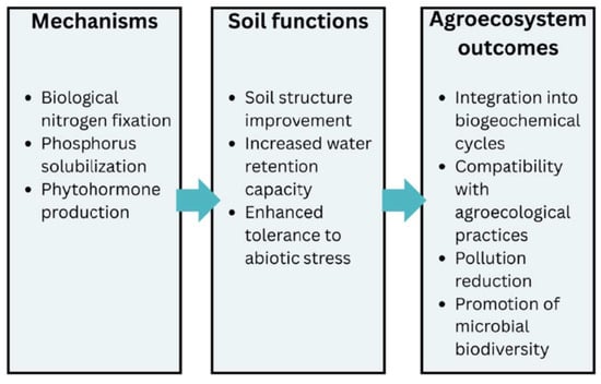 Microorganisms involved in biofertilization perform multiple functions that converge towards improving soil fertility and the resilience of agroecosystems. Atmospheric nitrogen-fixing bacteria, such as Rhizobium, Azotobacter, or Azospirillum, transform gaseous nitrogen into a form accessible to plants, reducing the need for the application of synthetic fertilizers and preventing the pollution associated with their excessive use. Phosphate-solubilizing bacteria, such as Pseudomonas and Bacillus, release phosphorus locked in insoluble mineral forms, making it available to plants and thus optimizing the phosphorus cycle. In addition, arbuscular mycorrhizal fungi, through their extensive network of hyphae, enhance nutrient and water absorption, improve soil structure, and increase plant tolerance to abiotic stresses such as drought, salinity, or extreme temperatures [65,66,67,68] (Figure 7).