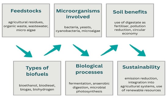 Biofuel production is one of the most dynamic research and application directions in the context of the global transition to renewable energy sources, and microorganisms play a central role in this process. In the last two decades, interest in bioenergy has increased with the background of the rising costs of fossil fuels, the pressure to reduce greenhouse gas emissions, and the need to develop energy systems integrated with sustainable agriculture. The use of microorganisms in biofuel production is based on their ability to transform renewable biological resources, including agricultural waste and organic residues, into liquid, gaseous, or solid fuels with high energy value, while reducing pollution and contributing to the circular economy [82,83,84,85,86,87] (Figure 8).