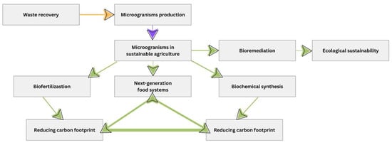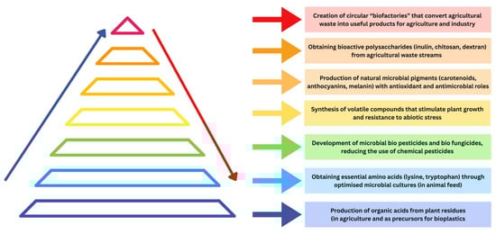 Biochemical synthesis by microorganisms has become an increasingly relevant component of strategies for sustainable agriculture. At the confluence of biotechnology, circular economy, and agricultural ecology, the process of producing value-added compounds (such as organic acids, biodegradable polymers, nutraceuticals, biopesticides, and bioingredients) has considerable potential to transform agricultural resource flows into a regenerative and profitable system [115,116,117] (Figure 9).