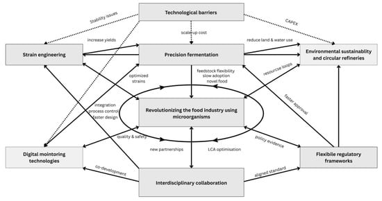 Global food systems are at a critical inflection point, where demographic pressures, climate change, and natural resource degradation require a profound reform of the way we produce and consume food [1,2,3]. In this context, microorganisms are emerging as a transformative force, capable of redefining processes in agriculture, bioenergy, waste remediation, and human nutrition through sustainable and renewable biotechnologies. The use of traditional fermentation and modern techniques (such as precision fermentation, metabolic engineering, and omics-based fermentation) not only optimizes the yield of microbial valorization products, but also allows rapid adaptation to varied feedstocks, contributing to reducing carbon emissions and food waste [4,5,6].