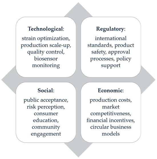 Another key set of barriers is regulatory and social. In terms of regulation, markets vary greatly; some jurisdictions have opened fast-track pathways for novel foods and have authorized products derived from precision fermentation or cultured products, while others, particularly some European regions, maintain long and complex procedures that slow down market access. In parallel, consumer perception and social acceptability play a critical role. Communication of safety, ethics, and environmental benefits influences adoption, and transparency regarding microbial processes and the provenance of raw materials is a determining factor. Therefore, the commercial success of next-generation systems depends not only on technology, but also on regulatory clarity and effective communication and labeling strategies [158,159,160,161].