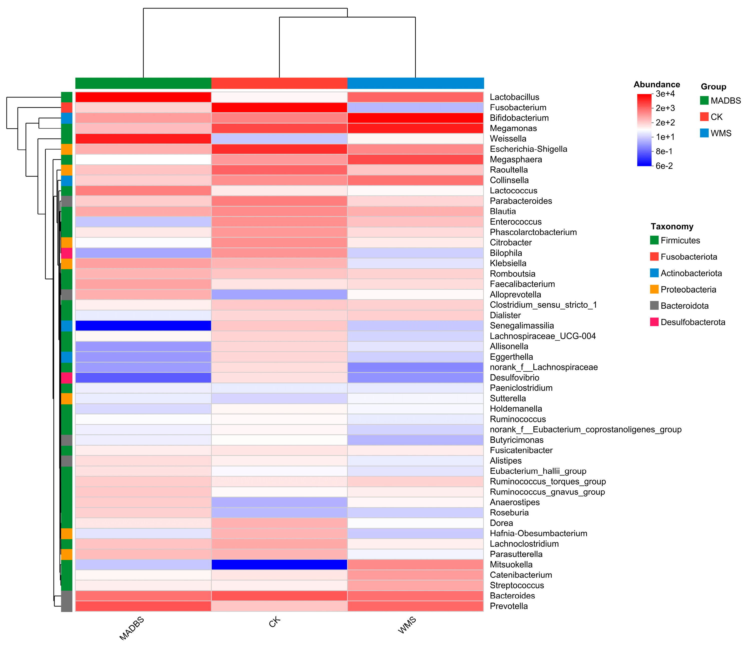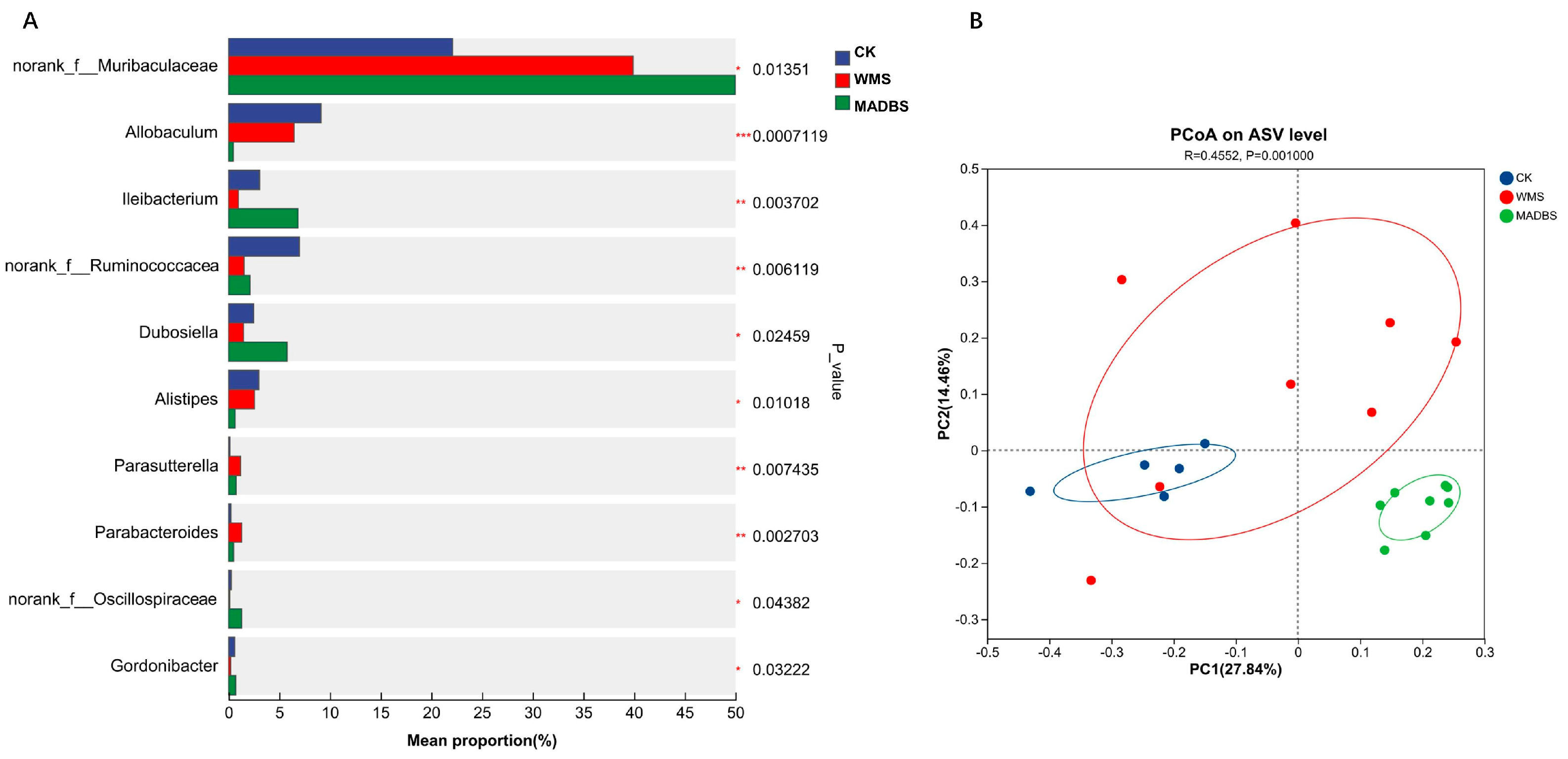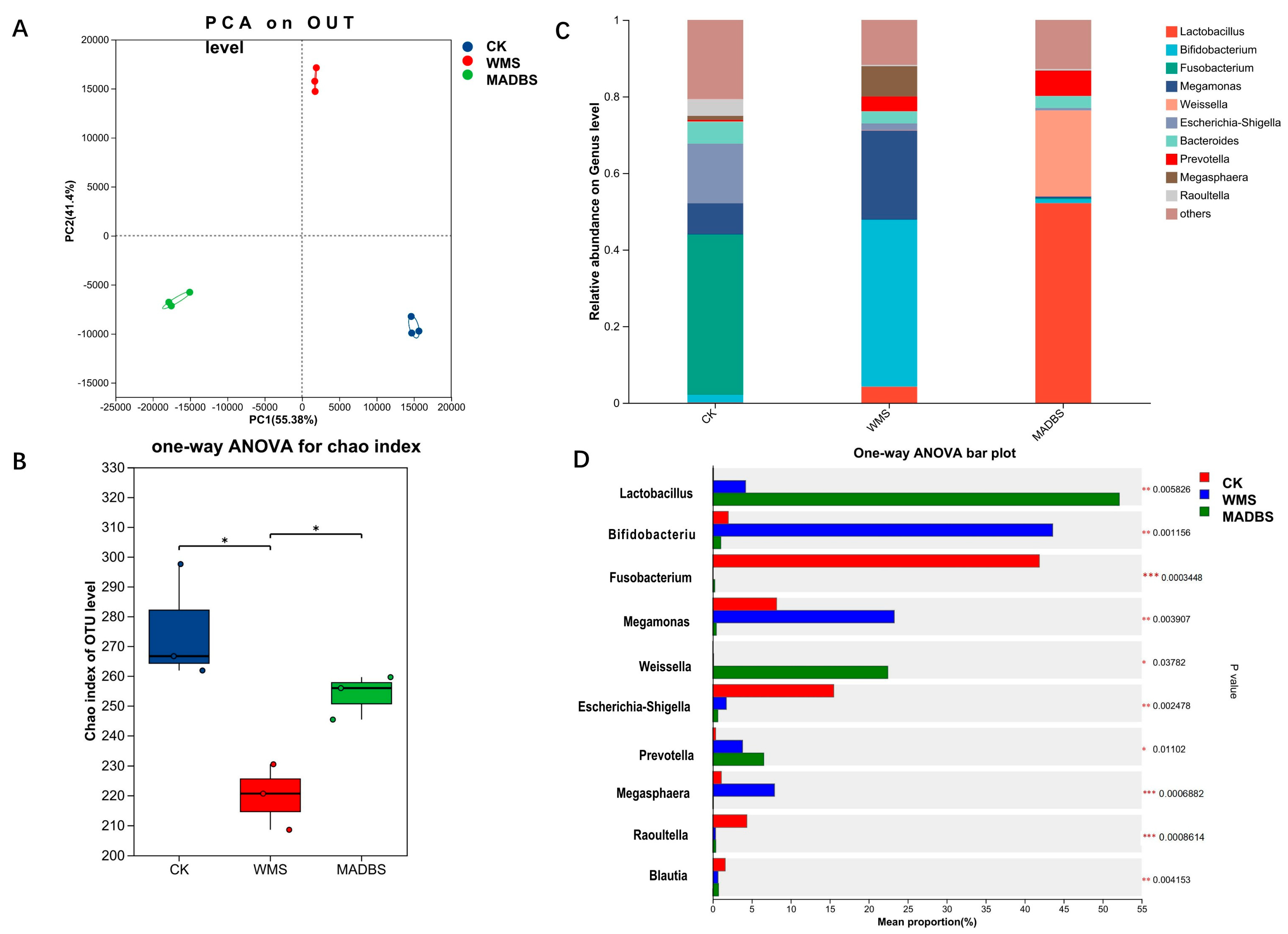 | Genus | CK-Mean (%) | MADBS-Mean (%) | WMS-Mean (%) | p Value |