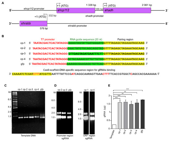 Figure 1A shows the schematic of the location of the three genes that conform the V1 locus. In order to achieve a knockout of the ehcp112 gene, ten cp-gRNAs candidates were designed, each of which contained the required PAM sites for DNA editing. The four highest-scoring cp-gRNAs were selected based on the algorithm provided by the Eukaryotic Pathogen CRISPR sgRNA Design Tool accessed on 26 October, 2022 (2015 version) (Table 1). Two of the selected cp-gRNAs were located in the promoter region and the other two in the gene’s ORF (Figure 1B). After obtaining the DNA templates carrying the sgRNA sequences (Table 1), the cp-gRNAs were transcribed using as primers the oligonucleotides corresponding to the designed cp-gRNAs and the Cas9-DNA specific sequence scaffold region. The resulting DNA templates were then used to obtain the mature cp-gRNAs. As a control, we used the sgRNA corresponding to the green fluorescent gene (Figure 1C–E).