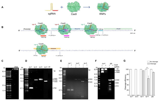 In vitro ehcp112 gene editing using the CRISPR-Cas9 strategy in E. histolytica. (A): Scheme of the sgRNA and the Cas9 to form the RNPs complexes. (B): Scheme illustrating the predicted position of the RNPs in the ehcp112 gene. As depicted in the DNA scheme, the ehcp112, ehadh, and ehrabb genes are represented. Numbers: Regions where RNPs binds in the V1 virulence locus. Scissors: Cleavage sites. (C–F): Products obtained following RNP treatment analyzed in 2% agarose gels. (C): Genomic DNA of E. histolytica. (D): PCR-amplified products of the regions containing cp-1, cp-2, cp-3, cp-4, and negative control (ctl-). (E,F): cp-1, cp-2, cp-3, cp-4, and gfp transcripts after interaction with the RNPs as described in the Section 2. (G): Densitometry of the RNP cleavage efficiency quantification * p < 0.05.