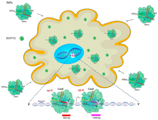Cartoon of the in vivo CRISPR-Cas9 system predicting the knockout of the ehcp112 gene. The scheme shows hypothetical results after soaking the trophozoites with the RNPs that efficiently cleavage the DNA. Bottom: Scheme of the predicted DNA cleavage sites assuming that the RNPs pass through the plasma and nuclear membranes in order to reach the target gene.