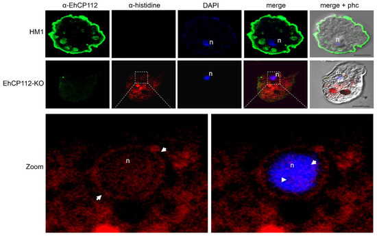 Confocal laser microscopy of the RNPs inside the cell and the nucleus. Images of the HM1:IMSS trophozoites and the EhCP112-KO trophozoites labeled with α-EhCP112 antibodies (green) and α-histidine antibodies (red), to track the RNPs inside the cell. n: Nuclei stained by DAPI (blue). Zoom: Magnification of the EhCP112-KO nucleus region marked with square dotted lines in the upper panel. Arrows: RNPs in the nucleus and the nucleus periphery. Right panel: DAPI and α-histidine merging.