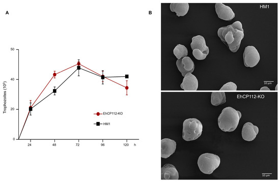Growth curve and scanning electron microscopy of the EhCP112-KO trophozoites. (A): Trophozoites were incubated in TYI-S-33 medium for different times, and the number of cells was counted each 24 h. (B): Control and mutant trophozoites were glutaraldehyde-fixed and treated for SEM as described in the Section 2. The cells showed membrane depressions in the EhCP112-KO trophozoites.