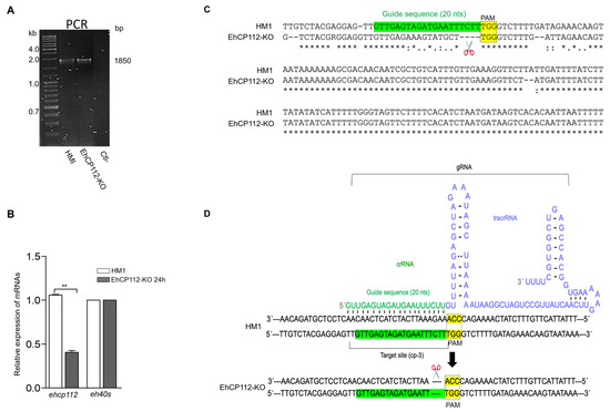 EhCP112-KO gene editing. (A): PCR of the 1850 bp containing the edited region and negative control (Ctl-). (B): RT-qPCR of the ehcp112 gene in the EhCP112-KO trophozoites after 24 h RNPs treatment. The eh40s gene was used as a control ** p < 0.01. (C): DNA sequence of the ehcp112 gene fragment containing the edited region (scissors). sgRNA sequence: Green. PAM sequence: Yellow. Points: Changed bases in the mutant. Asterisks: Conserved bases in both populations. (D): Scheme representing the secondary structure of the gRNA in hybridization with the DNA of the HM1:IMSS trophozoites to produce the mutation.