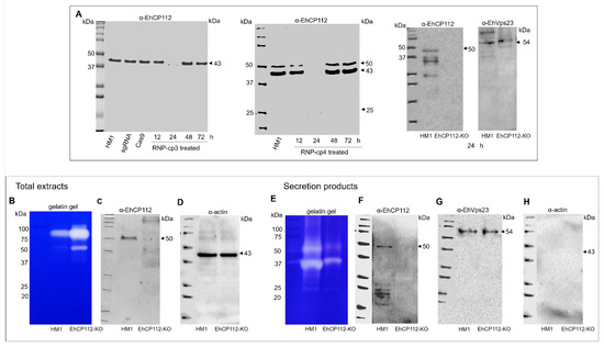 Western blot assays and protease activity of the HM1:IMSS and EhCP112-KO trophozoites. Trophozoites were lysed in the presence of an inhibitor mix as described in the Section 2. (A): Total proteins separated in 12.5% SDS-PAGE and transferred onto nitrocellulose membranes, incubated with rabbit α-EhCP112 antibodies followed by α-rabbit-HRP-labeled antibodies. Upper panel: Trophozoites treated with RNP-cp-3. Bottom panel: Trophozoites treated with RNP-cp4. (B): Gelatin gel of total extracts of the HM1:IMSS and the EhCP112-KO trophozoites. (C): Parallel Western blot of proteins in (B) using α-EhCP112 antibodies and the secondary α-rabbit-HRP-labeled antibodies. (D): Western blot using mouse α-actin and α-mouse HRP-labeled antibodies as loading control. (E): Gelatin gel of secretion products of theHM1:IMSS and the EhCP112-KO trophozoites. (F): Parallel Western blot of secretion products from the HM1:IMSS and the EhCP112-KO trophozoites. (G): Parallel Western blot using α-EhVps23 as a secretion control. (H): Parallel Western blot using α-actin as a cellular integrity control.