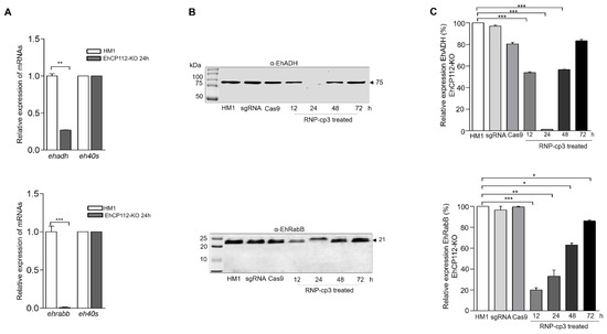 The ehadh and ehrabb genes were knocked out as an effect of the CRISPR-Cas9 trophozoite treatment. (A): RT-qPCR of ehadh (upper) and ehrabb (bottom). The eh40s gene was used as a control. (B): Trophozoites lysed in the presence of an inhibitor mix as described in the Section 2. and transferred onto nitrocellulose membranes. Membranes were cut and the upper part of the membrane was incubated with α-EhADH antibodies and the bottom part with α-EhRabB antibodies followed by the respective HRP-labeled secondary antibodies. (C): Densitometry of bands in (B) * p < 0.05, ** p < 0.01 and *** p < 0.001.