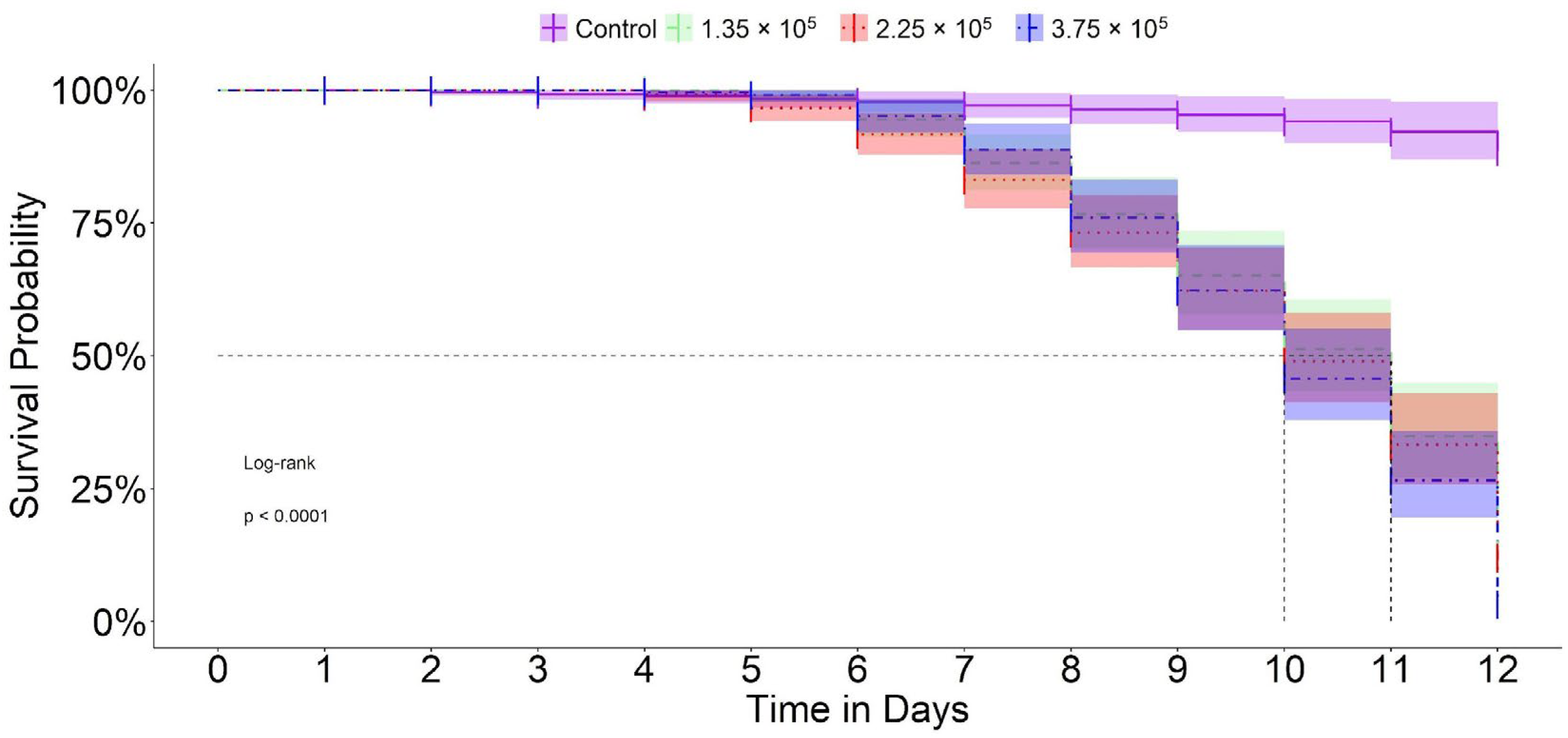 - Georgievska, L.; Hoover, K.; van der Werf, W.; Muñoz, D.; Caballero, P.; Cory, J.S.; Vlak, J.M. Dose dependency of time to death in single and mixed infections with a wildtype and egt deletion strain of Helicoverpa armigera nucleopolyhedrovirus. J. Invertebr. Pathol. 2010, 104, 44–50. [Google Scholar] [CrossRef][Green Version]