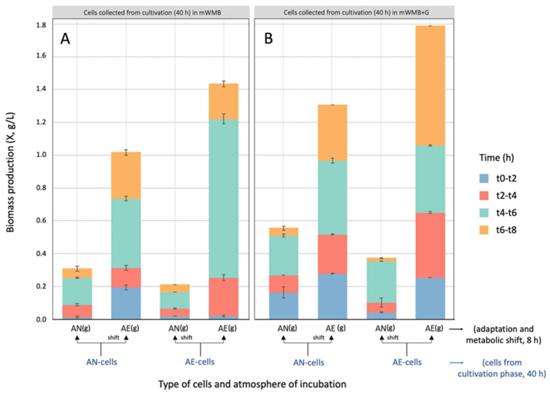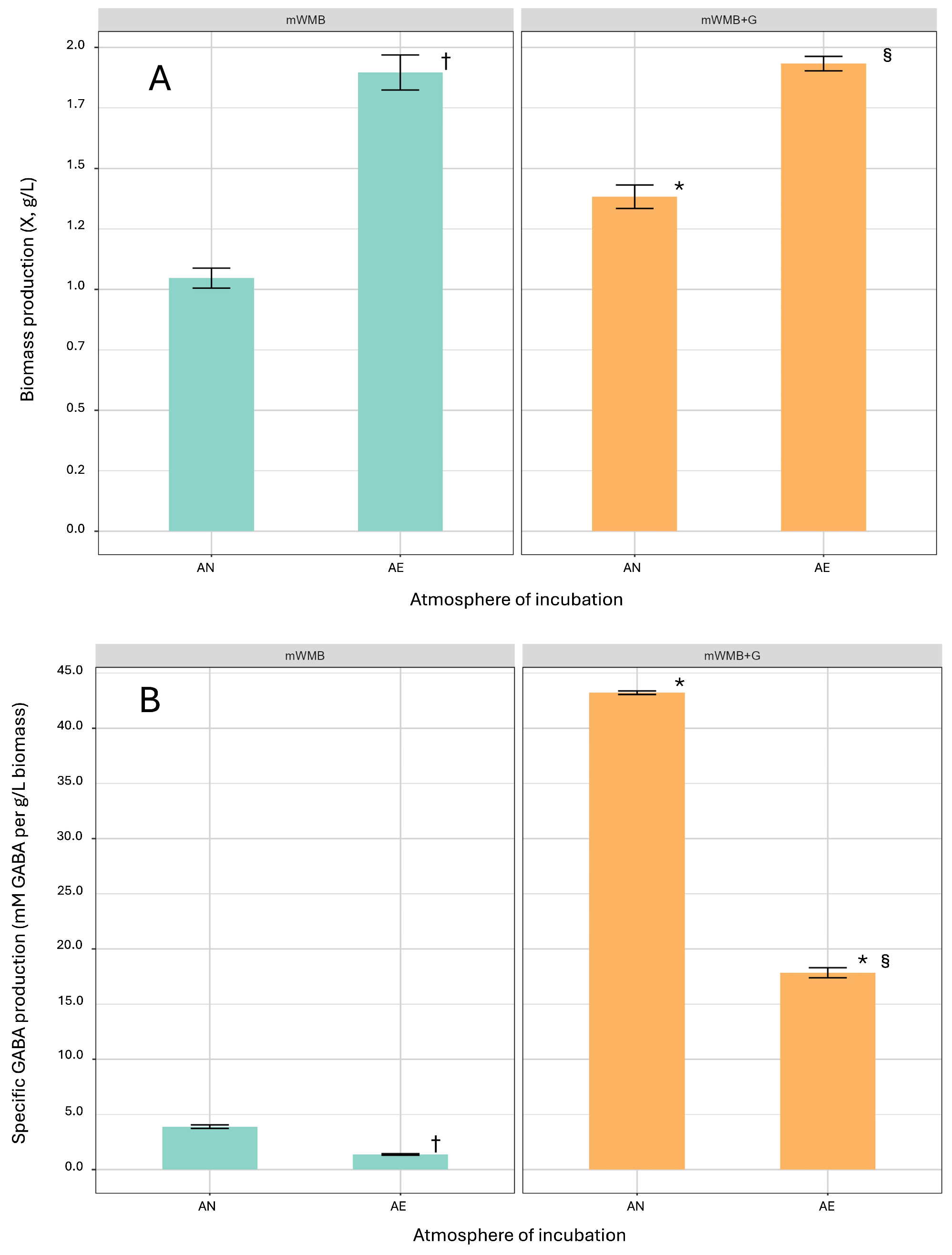 2.4. Effect of Glutamate Induction and Atmosphere of Incubation on Biomass Yield and GABA Production
