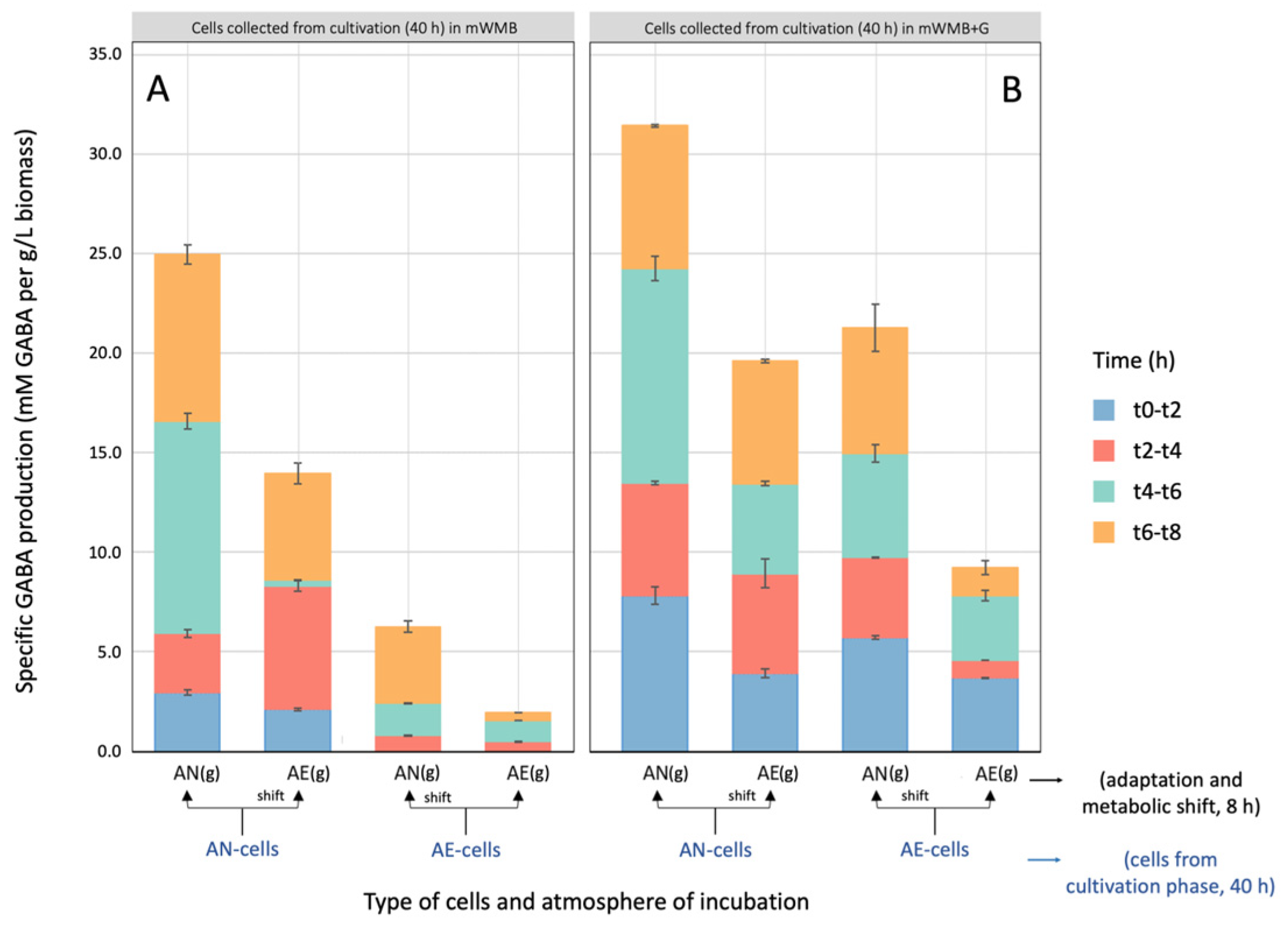 - Zotta, T.; Faraone, I.; Giavalisco, M.; Parente, E.; Lela, L.; Storti, L.V.; Ricciardi, A. The production of γ-aminobutyric acid from free and immobilized cells of Levilactobacillus brevis cultivated in anaerobic and aerobic conditions. Microorganisms 2022, 10, 2184. [Google Scholar] [CrossRef]