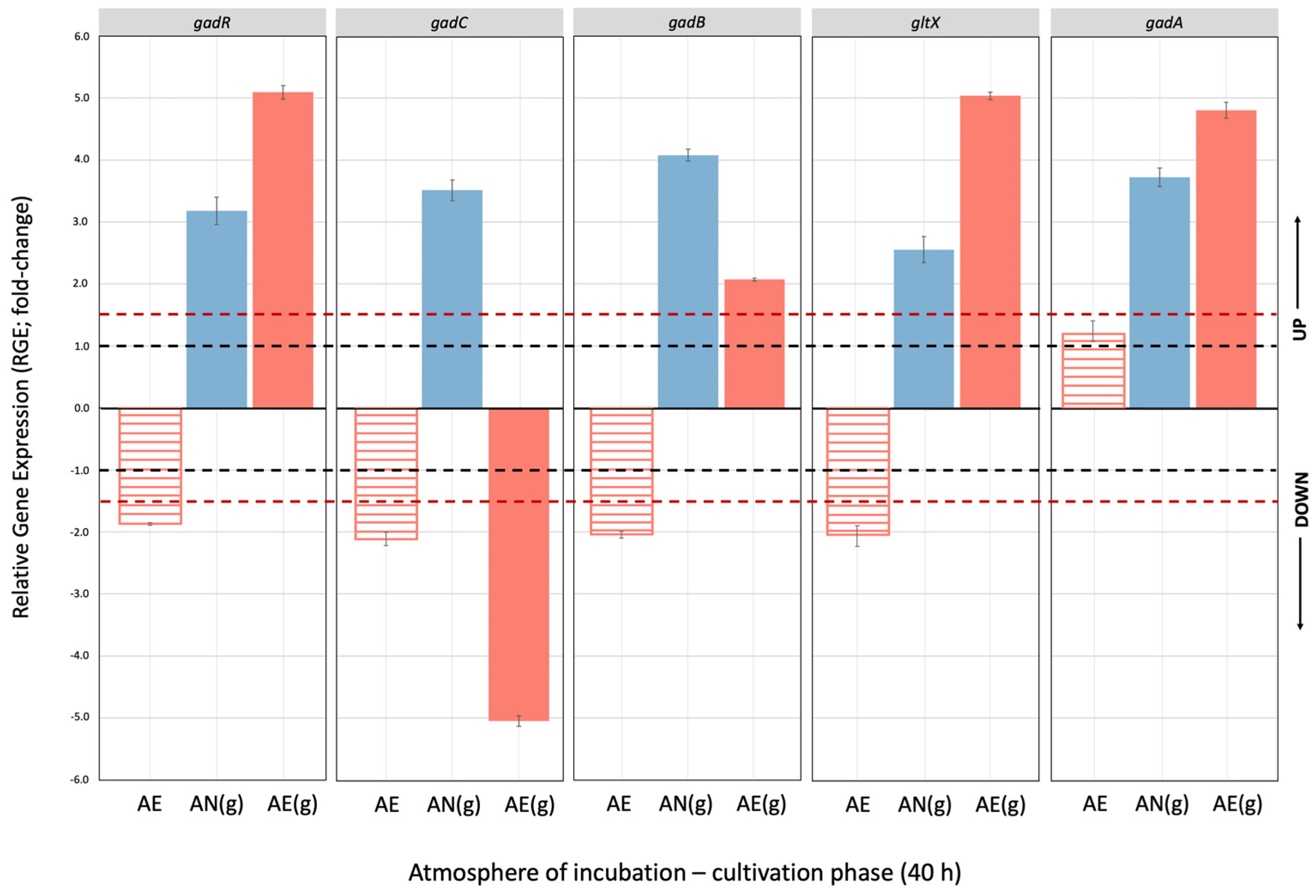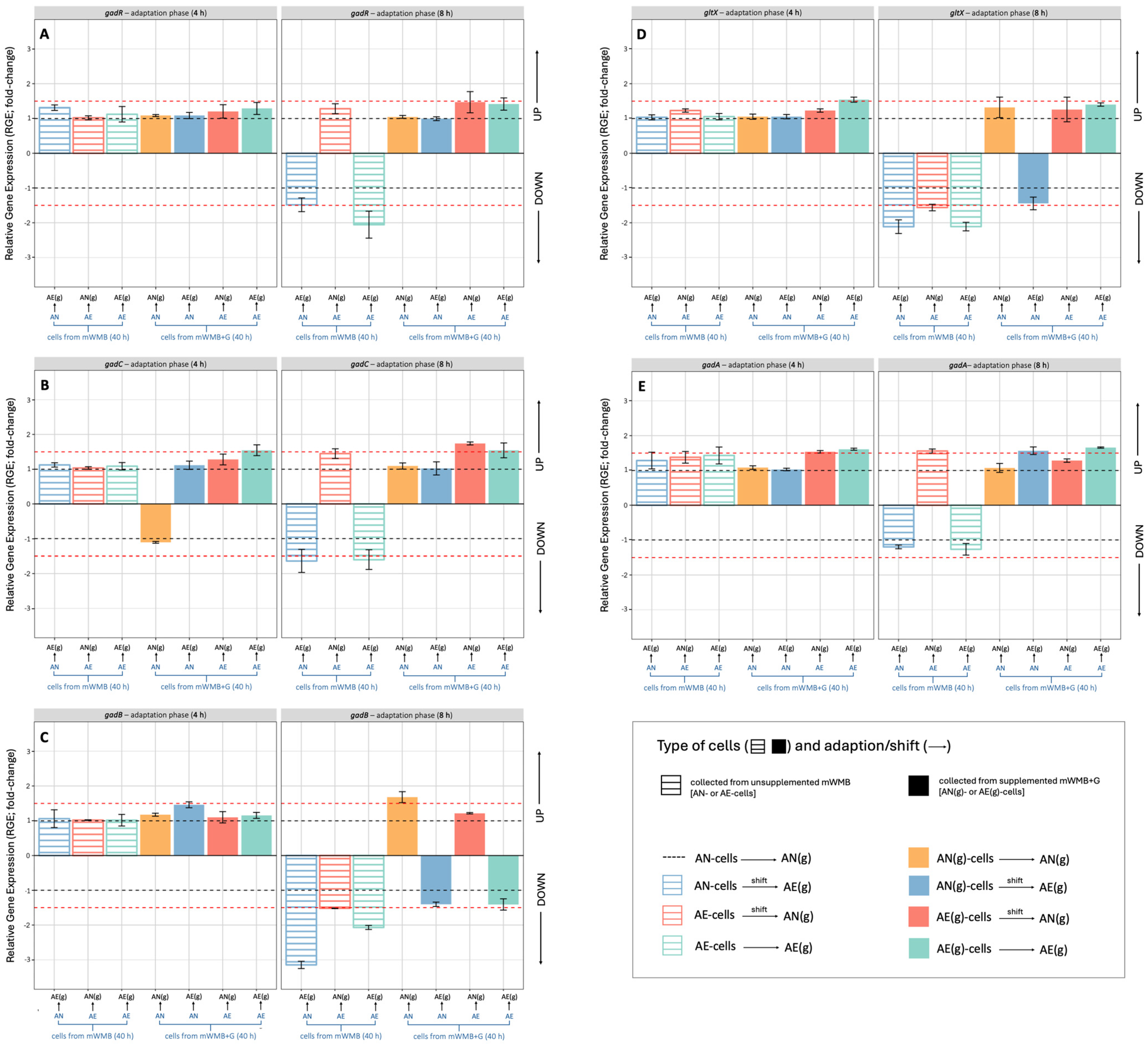 2.5. Effect of Glutamate Induction and Atmosphere of Incubation on Relative Expression of GAD Operon Genes