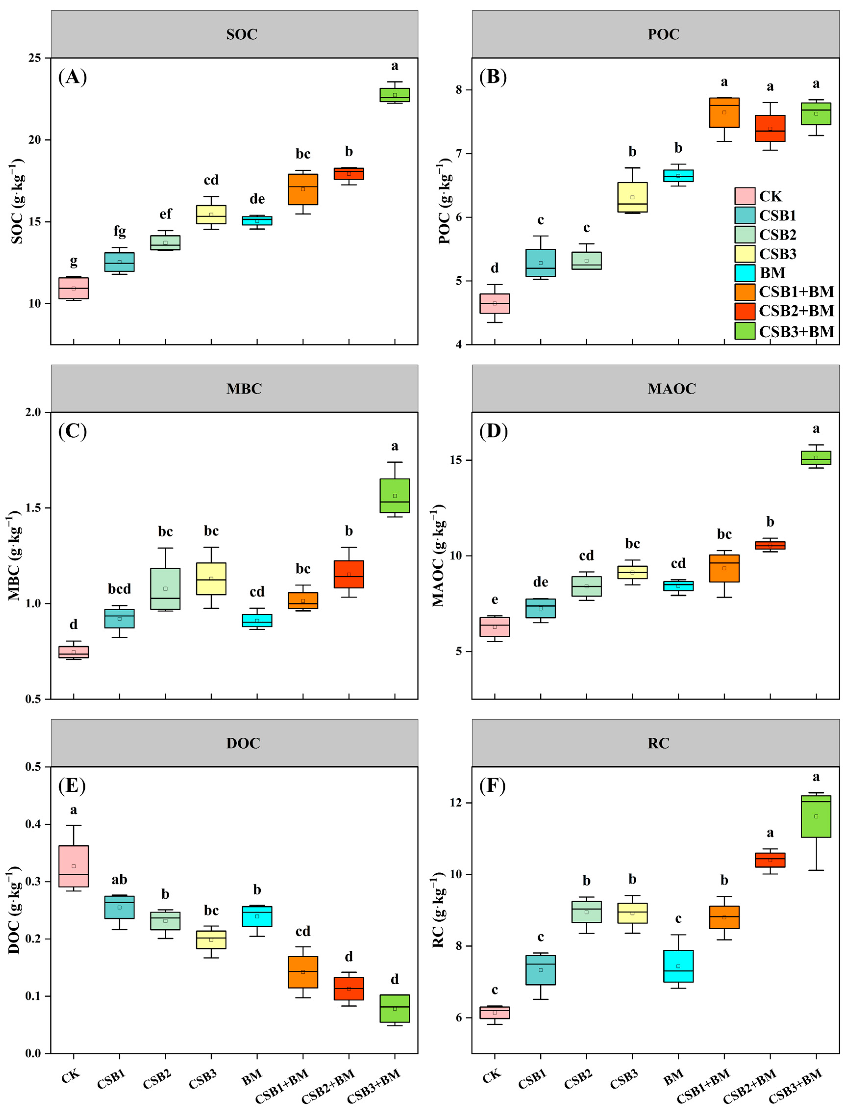 4.2. Responses of Soil Organic Carbon Fractions by Biochar and BM Amendments