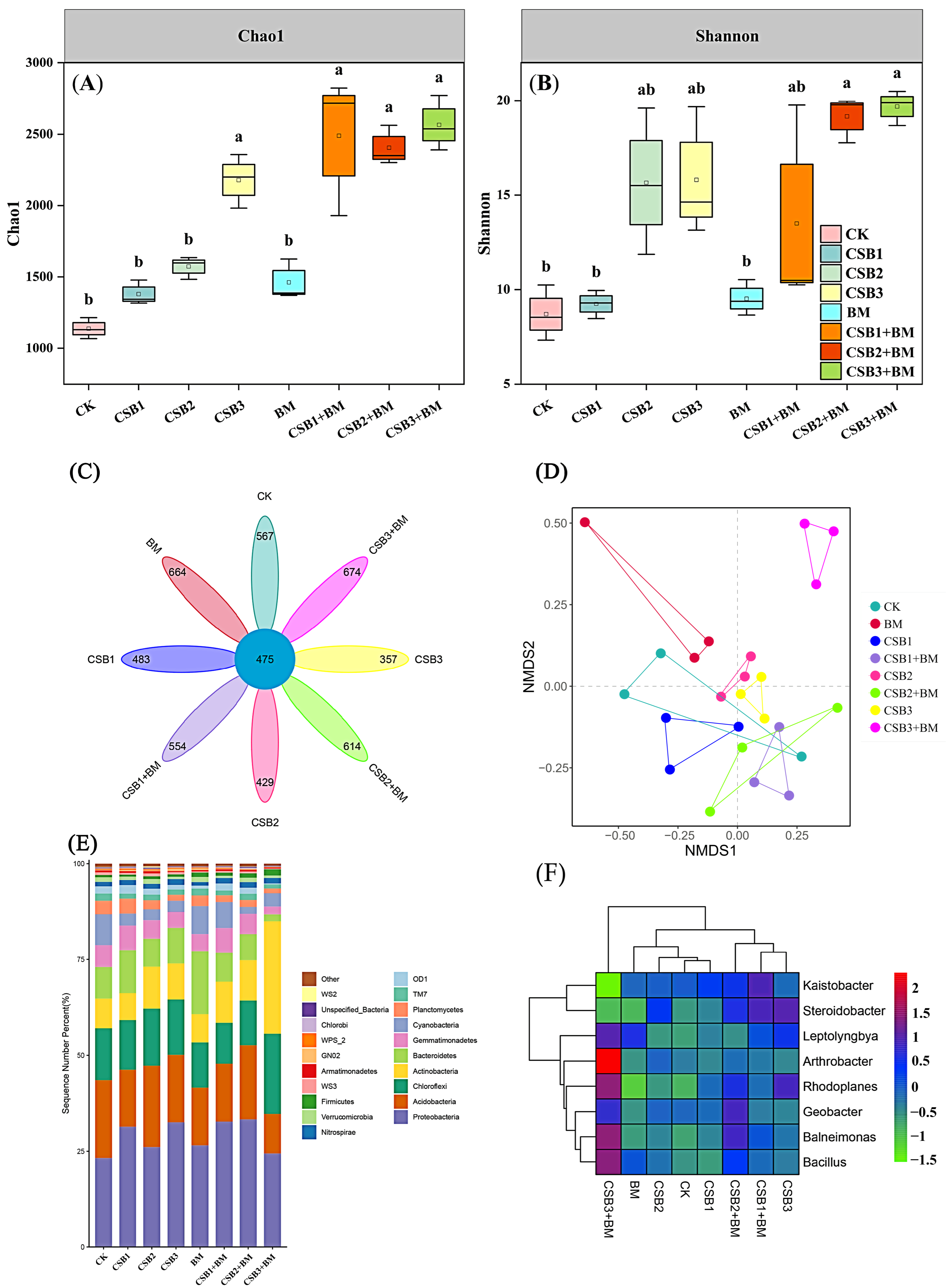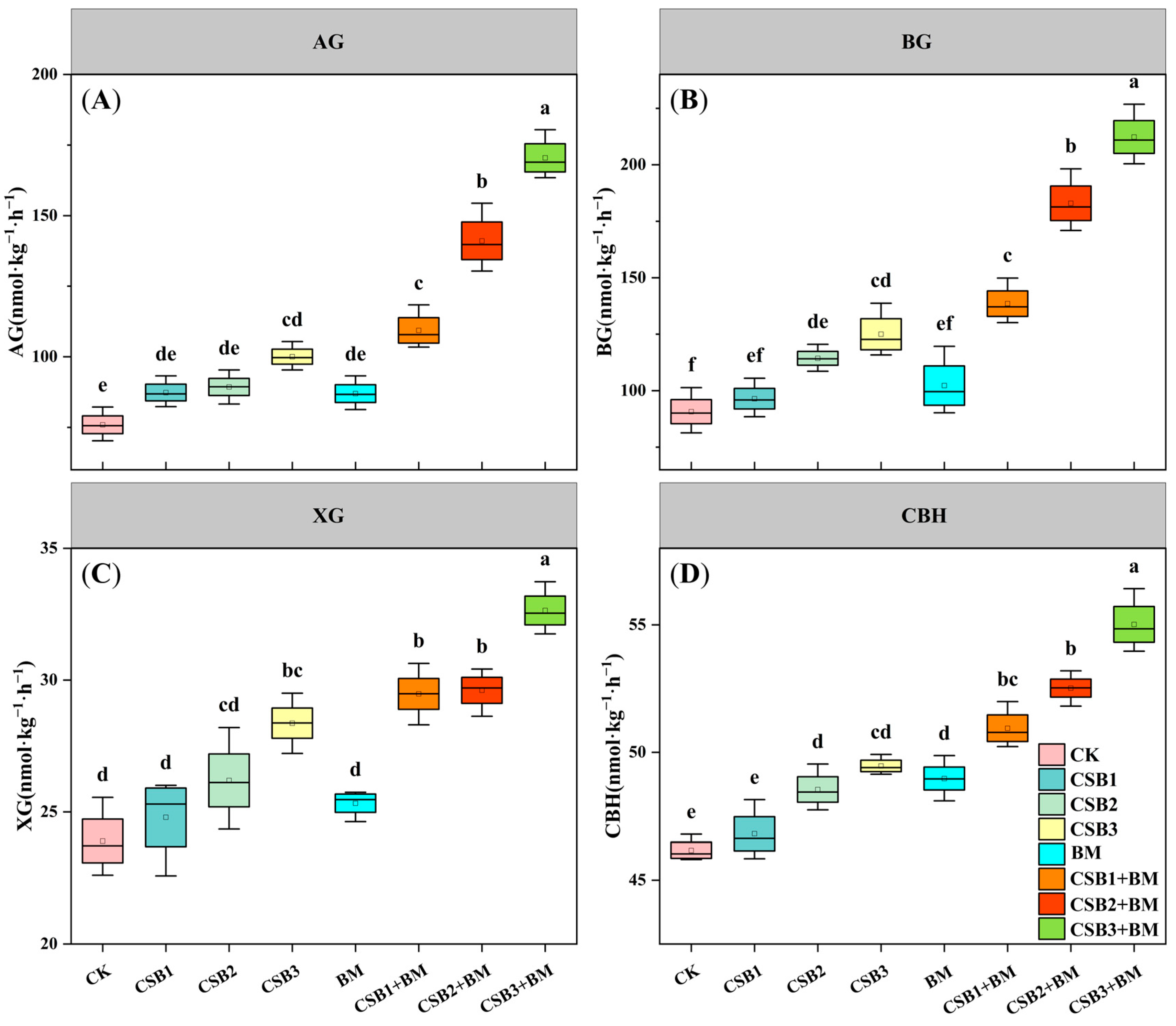 | CSB2 + BM | 0.73 ± 0.04 ab | 0.92 ± 0.05 ab | 1.64 ± 0.02 b | 151.76 ± 9.07 bcd |