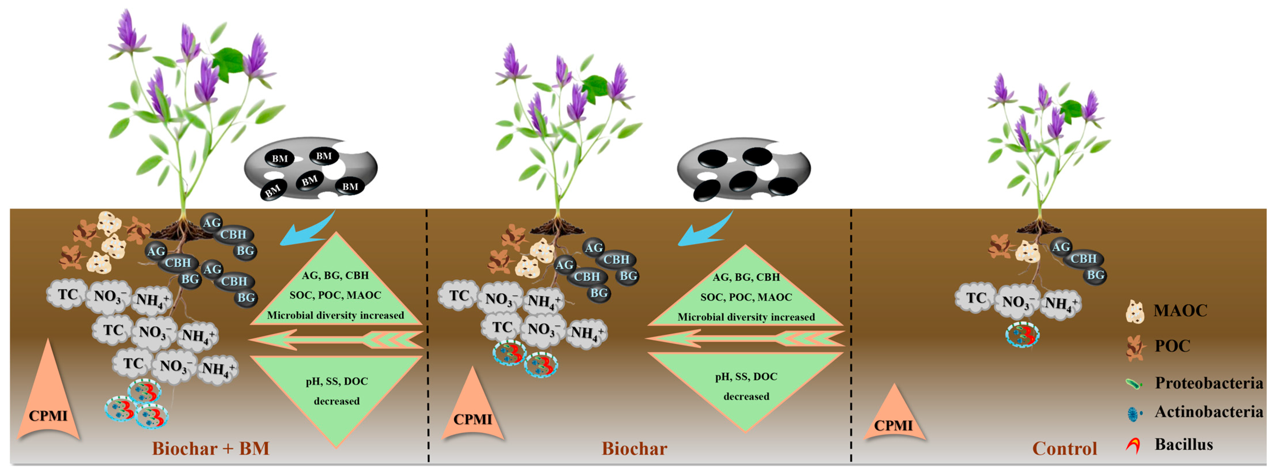 4.3. Effects of Biochar and BM Application on Bacterial Community Diversity and Composition