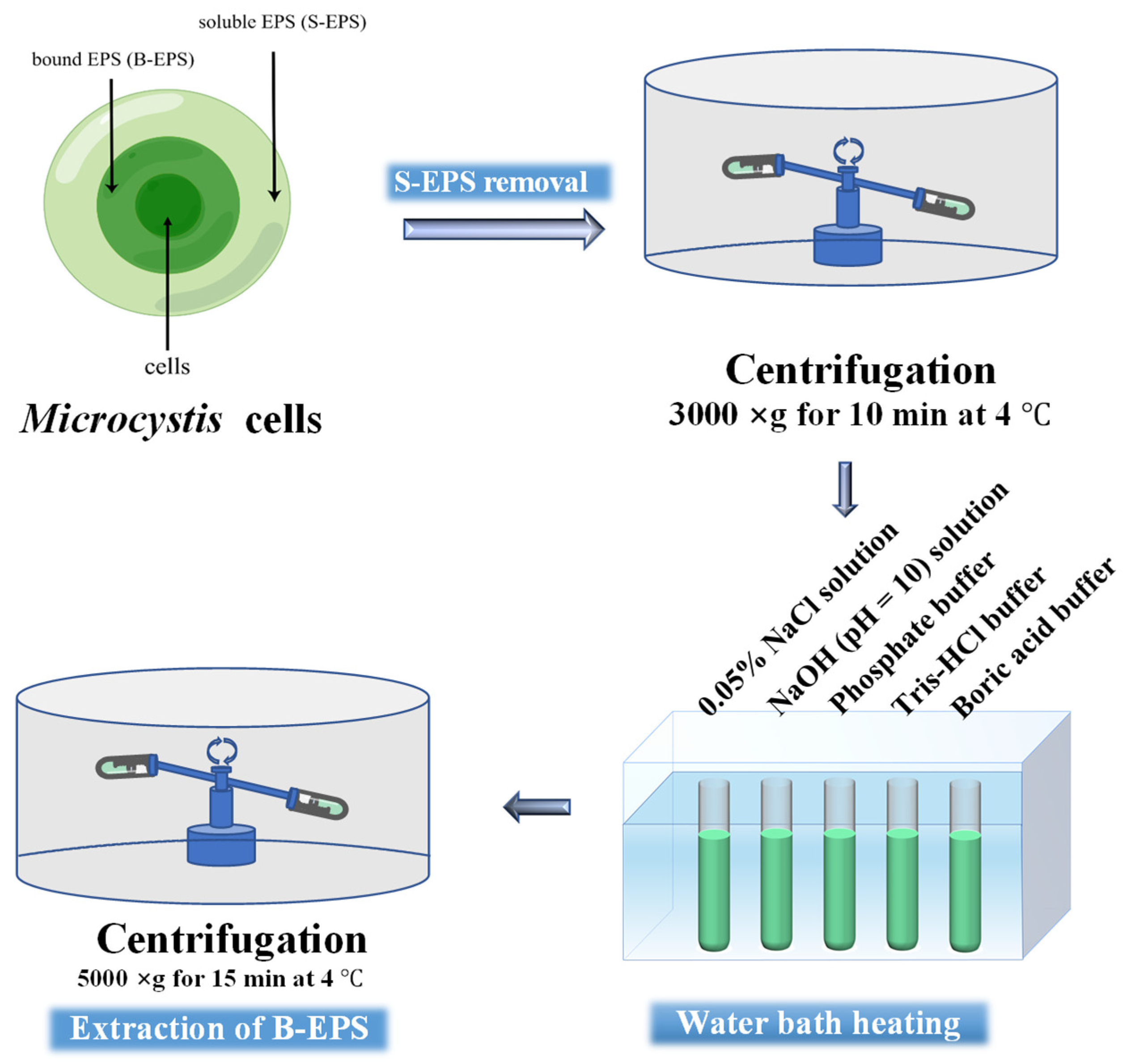 - Huang, R.X.; He, Q.; Ma, J.; Ma, C.X.; Xu, Y.H.; Song, J.H.; Sun, L.L.; Wu, Z.S.; Huangfu, X.L. Quantitative assessment of extraction methods for bound extracellular polymeric substances (B-EPSs) produced by Microcystis sp. and Scenedesmus sp. Algal Res. 2021, 56, 102289. [Google Scholar] [CrossRef]